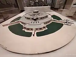 As originally built, the interior consisted of concentric rings of rooms and offices with corridors between them,[2] designed to keep arriving and departing passengers separate.[14] Six telescopic covered corridors led from the main concourse, allowing six aircraft to be in use at one time. A subway led from the terminal to the new station, 130 yards (119 m) away, ensuring that passengers arriving by train from London stayed undercover from the time they arrived at Victoria station until the time their aircraft reached its destination.[6][5]