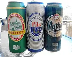 Olympic Brewery[30] Sindos Mythos, Henninger Kaiser Double Malt, Henninger Kaiser Blonde, Mythos Red, Mythos Radler, Golden Lager, Spartan, Aegean, Aris, Henninger Lager, Elomas, Zythia, Ey Zython, Mythos Ice, Mythology Lager, El Beer, Beeroni 1968