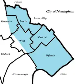 - ^ City Population Archived 11 February 2003 at the Wayback Machine – Census 2001: Ward-level populations (Central 4,752; North 5,915; Rylands 5,376; West 4,966)