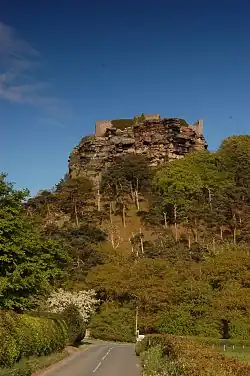 The castle is built on Beeston Crag, which is in the southerly part of the Mid Cheshire Ridge, a chain of low sandstone hills that stretches from the River Mersey down to the central region of the Cheshire Plain. The low-lying area between the southerly and the northern ranges of the ridge is known as the Beeston Gap. It was formed by a meltwater channel at the end of the Ice age.[5]