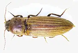 The oldest known beetle is Coleopsis, from the earliest Permian (Asselian) of Germany, around 295 million years ago.[26] Early beetles from the Permian, which are collectively grouped into the "Protocoleoptera" are thought to have been xylophagous (wood eating) and wood boring. Fossils from this time have been found in Siberia and Europe, for instance in the red slate fossil beds of Niedermoschel near Mainz, Germany.[27] Further fossils have been found in Obora, Czech Republic and Tshekarda in the Ural mountains, Russia.[28] However, there are only a few fossils from North America before the middle Permian, although both Asia and North America had been united to Euramerica. The first discoveries from North America made in the Wellington Formation of Oklahoma were published in 2005 and 2008.[29][30] The earliest members of modern beetle lineages appeared during the Late Permian. In the Permian–Triassic extinction event at the end of the Permian, most "protocoleopteran" lineages became extinct. Beetle diversity did not recover to pre-extinction levels until the Middle Triassic.[31]