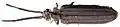 Beetle antennae are primarily organs of sensory perception and can detect motion, odor and chemical substances,[66] but may also be used to physically feel a beetle's environment. Beetle families may use antennae in different ways. For example, when moving quickly, tiger beetles may not be able to see very well and instead hold their antennae rigidly in front of them in order to avoid obstacles.[67] Certain Cerambycidae use antennae to balance, and blister beetles may use them for grasping. Some aquatic beetle species may use antennae for gathering air and passing it under the body whilst submerged. Equally, some families use antennae during mating, and a few species use them for defense. In the cerambycid Onychocerus albitarsis, the antennae have venom injecting structures used in defense, which is unique among arthropods.[68] Antennae vary greatly in form, sometimes between the sexes, but are often similar within any given family. Antennae may be clubbed, threadlike, angled, shaped like a string of beads, comb-like (either on one side or both, bipectinate), or toothed. The physical variation of antennae is important for the identification of many beetle groups. The Curculionidae have elbowed or geniculate antennae. Feather like flabellate antennae are a restricted form found in the Rhipiceridae and a few other families. The Silphidae have a capitate antennae with a spherical head at the tip. The Scarabaeidae typically have lamellate antennae with the terminal segments extended into long flat structures stacked together. The Carabidae typically have thread-like antennae. The antennae arises between the eye and the mandibles and in the Tenebrionidae, the antennae rise in front of a notch that breaks the usually circular outline of the compound eye. They are segmented and usually consist of 11 parts, the first part is called the scape and the second part is the pedicel. The other segments are jointly called the flagellum.[66][69][70]
