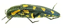 Fossil buprestid beetle from the Eocene (50 mya) Messel pit, which retains its structural color[45]