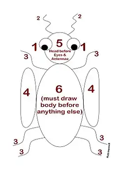 It is necessary to roll the correct number for the body before any other part may be drawn. To the body, one may attach the head, legs or wings, but the head must precede the antenna and eyes. The first player to draw all the requisite parts is the winner.