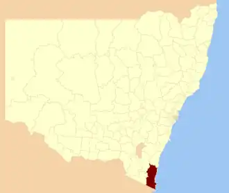 The Bega Valley Shire is a local government area located adjacent to the south-eastern coastline of New South Wales, Australia. The Shire was formed in 1981 with the amalgamation of the Municipality of Bega, Imlay Shire and Mumbulla Shire,[3] with its name deriving from the town of Bega. The shire is also known as the Sapphire Coast for tourism and marketing purposes. During the 2019–20 Australian bushfire season, the area was devastated by fire, with 448 houses being destroyed by fire[4] and approximately 365,000 hectares burned, which is 58% of the Shire's total land mass.[5]