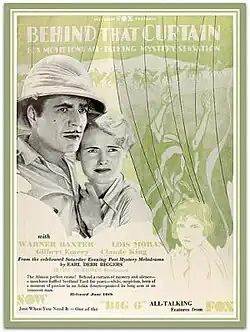 Behind That Curtain is a 1929 American sound (All-Talking) Pre-Code mystery film directed by Irving Cummings and starring Warner Baxter, Lois Moran and Gilbert Emery.[1] It was the first Charlie Chan film to be made at Fox Studios. It was based on the 1928 novel of the same name. Charlie Chan, who is played by the Chinese American E. L. Park, gets one mention early in the film, then makes a few momentary appearances after 75 minutes. Park, in fact, was the first Chinese American to play Charlie Chan on-screen.[2] Producer William Fox chose this film to open the palatial Fox Theatre in San Francisco on June 28, 1929. It is a sound film.