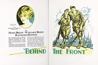 Behind the Front is a 1926 American silent war comedy film directed by A. Edward Sutherland and starring Wallace Beery and Raymond Hatton. It was produced by Famous Players–Lasky and distributed by Paramount Pictures.[1][2] The film was based on the novel The Spoils of War by Hugh Wiley.[3]