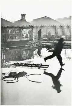 The spontaneous photograph was taken by Cartier-Bresson at the Place de l'Europe, outside the Saint-Lazare train station, in Paris, with his portable Leica camera. In this case, he took aim at a man who leaps above a shallow flooded space, without touching it, while his shadow is reflected beneath him, near a partially submerged ladder. Behind him posters in a wall advertise the pianist Alexander Brailowsky and dancers - that seem to echo the man's movement - although Cartier-Bresson stated that he had not noticed the posters until afterwards. The man is forever framed in the air, without touching the water, capturing the moment before he inevitably lands in the pool. This was one of the few photographs that the artist cropped. Cartier-Bresson explained that "There was a plank fence around some repairs behind the Gare [Saint] Lazare, and I was peeking through the spaces with my camera eye. This is what I saw. The space between the planks was not entirely wide enough for my lens, which is the reason the picture is cut off on the left.” The uncropped photograph shows the heavy dark shadow with a blurred edge on the left but also displays an uninspiring space below the pool which has also been removed.[4][5][6]