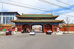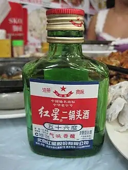 During the Chinese Civil War the seeds of Beijing Hongxing were sewn when the People's Republic banned the private production and sale of liquor and implemented a state monopoly on production. In May of that year, the "North China Liquor Company" (later renamed Beijing Distillery) was founded, merging 12 distilleries in the region, become the first state owned distillery in the newly founded People's Republic, and becoming the sole legal producer of erguotou baijiu. The first batch of erguotou was produced in September and named Hong Xing (红星;"Red Star") in honor of the founding of the republic. The soon to be iconic label was designed by a Japanese Red Army enlistee named Sakurai.[3] Hongxing became one of the first trademarks registered in the nation in 1951 and demand for the drink only grew. In 1965, in an attempt to keep up with demand, and to keep prices low and accessible in accordance with the directions of then premier, Zhou Enlai Beijing Honxing took over management of 19 distilleries in the surrounding region where production of erguotou baijiu could be expanded into. Eventually, Beijing Hongxing relinquished the trademark for the exclusive use of the term "erguotou" in 1981. Throughout these years however, Beijing Hongxing retains the legacy of the Zhou brothers that had originally developed erguotou as Ai Jinzhong, the 9th generation descendent of the Zhou brothers serves as director of production.[4] [5] [6] [7]
