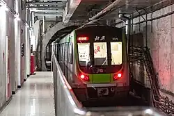 Type-A cars run on Lines 11, 14, 16, 17, 19 and under construction Lines 3 and 12. They are 3.1 meters longer, and 20 cm wider than Type-B cars with a designed capacity of 310 passengers per car and 10 sets of doors per train compared to 8 sets of doors per train on Type-B cars.[9][8] Type A cars draw 1,500 V DC power from overhead wire and can reach 100 km/h (62 mph). Line 14 uses six-car Type A train sets which can carry 1,860 passengers per train and allow for throughput of up to 55,800 passengers per hour per direction. Lines 16, 17 and 19 uses eight-car Type-A train sets which can carry 2,480 passengers per train and allow for throughput of up 74,400 passengers per hour per direction.[8]