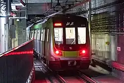 The S1 Line's maglev trains feature six-car train sets that run on 1,500 V DC power and can reach 100 km/h (62 mph).[14] Compared to subway trains that run on conventional track, the maglev train has a smaller minimum turning radius of 75 meters compared to 200 meters, can climb steeper slope of 53‰ versus 40‰ and emits less noise.[15] The six-car train set can carry 1,032 passengers.[15]