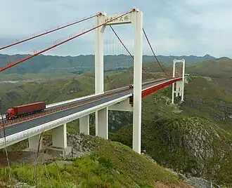 Beipan River Hukun Expressway Bridge is a suspension bridge near Guanling, on the border of the Anshun Prefecture, Guizhou, China. The bridge has a main span of 636 metres and is part of the G60 Shanghai–Kunming Expressway crossing the Beipan River. It stands at a height of 318 metres above the river, placing it amongst the 15 highest bridges in the world.