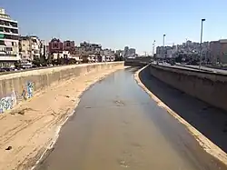 The Beirut River (Arabic: نهر بيروت, Nahr Bayrūt) is a river in Lebanon separating the city of Beirut from its eastern suburbs, primarily Bourj Hammoud and Sin el Fil. The river flows mostly east to west from snow drains and springs on the western slopes of Mount Kneisseh and the southern end of Mount Sannine[1] near the towns of Hammana and Falougha,[2] before curving north and emptying at Beirut's northern Mediterranean coast, east of the Port of Beirut. According to popular legend, St. George slew the dragon in a spot near the mouth of the river.[3]