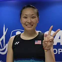 Beiwen Zhang (simplified Chinese: 张蓓雯; traditional Chinese: 張蓓雯; pinyin: Zhāng Bèiwén; born 12 July 1990) is a badminton player who is a singles specialist. Born in China, she previously represented Singapore and currently represents the United States.[1] She won the women's singles title at the 2021 Pan Am Championships and at the 2023 Pan American Games.[2][3]