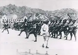 All of the Beiyang senior commanders remained loyal to the Qing dynasty,[83] and to some extent to Yuan Shikai,[84] who remained in contact with several officers.[85] Duan Qirui, Feng Guozhang, and Wang Shizhen were examples of senior commanders that had personal loyalty to Yuan. But some of the senior officers had served in the military bureaucracy of the central government or in provincial governments, developing their own connections, and after Yuan was dismissed from his posts he could no longer assist them with their own advancement. The Qing government had also given senior Beiyang officers traditional ranks in the Green Standard and Banner forces and had used Beiyang divisions as a palace guard. Others were much older and were loyal to the monarchy more than to Yuan Shikai. Among the junior officers, because Yuan chose to recruit them based on merit, many were from military schools outside of north China, or had studied abroad, and therefore were less likely to have personal loyalty to him.[84] The Japanese-trained officers were the most likely to have anti-Qing and anti-Yuan views.[86] After he was eventually called back by the imperial court, Yuan immediately removed several officers from command.[87] The Beiyang Army, unlike the older Huai Army founded by Li Hongzhang, was a bureaucratic organization with regular rotations of officers in command positions, appointment based on education and merit, and with funding being provided by the government instead of by an individual official.[86] Among ordinary soldiers of the Beiyang Army there was no widespread political sentiment, but there was resentment due to the strict discipline and poor living conditions.[56]