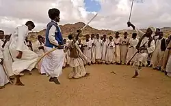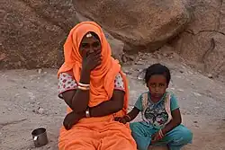 Some of the Beja speak a Cushitic language called Beja and some speak Tigre, a Semitic language; most speak Arabic.[1][6] In Eritrea and southeastern Sudan, many members of the Beni-Amer grouping speak Tigre. Originally, the Beja did not speak Arabic, but the migration of the numerous Arab tribes of Juhaynah, Mudar, Rabi'a, and many more to the Beja areas contributed to the Arabization and Islamization of them.[7][8] The Arabs did not however fully settle in the Beja areas as they looked for better climate in other areas.[8] The Beja have partially mixed with Arabs through intermarriages over the centuries,[8] and by the 15th century were absorbed into Islam.[8] The process of Arabization led to the Beja adopting the Arabic language,[7] Arab clothing,[9] and Arab kinship organization.[1]