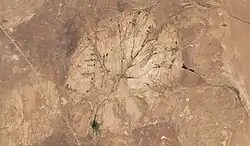 Bektauata is a small rocky range of moderate altitude located at the southern end of the Kazakh Upland system (Saryarka). The dry alluvial plain at the mouth of the Tokrau river lies to the east of the range. The nearest airport is Balkhash Airport.[2] There are rock formations, caves and rock pools in different spots of the Bektauata area. The largest cave is 48 meters (157 ft) in length. The inner part of the cave is full of water to a depth of 1.5 meters (4 ft 11 in).[1]