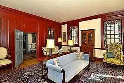 Perhaps the most notable feature in the house is a wooden partition that can be removed (by taking out the baseboard and kicking the panels out on dowels) to join the drawing room and the central hall into a 20 x 30 foot room for great occasions.[12] The partition is fully paneled on both sides, both above and below the chair rail. Complete with a 10-pane casement window on either side of the partition door, the design is extraordinary.