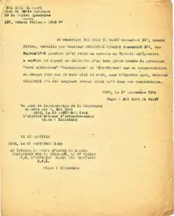 During the occupation of France, El Maafi joined the resistance and appeared to have various roles. Firstly, he provided information to the French internal resistance about Muslim resistance fighters to prevent infiltrators and collaborators from penetrating the resistance. In this capacity, he is believed to have recruited Djaafar Khemdoudi to join the resistance, as expressed in a letter to the military governor of Lyon in 1946.[6][18] He affected sympathy, with Julien Azario, towards the collaborationist authorities, but resisted in secret. Thus, he sacrificed a sheep at the Maison des Africans in Saint Antoine street on December 8, 1943, the day of Eid al-Adha,[19] in the presence of Alexandre Angeli, collaborationist prefect of the Rhône, Julien Azario and the head of the Lyon's Milice.[8] He also participated in such a ceremony in 1942.[20]
