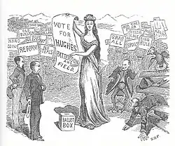 During the campaign, Hughes hold many speeches presenting his platform.[59] In the first three weeks of September 1876 alone, he travelled for campaign events to 15 different Colorado cities, speaking up to six nights per week.[60] The Republican newspaper Golden Weekly Globe, published an extensive report on Hughes's speech in Golden. In their report, the newspaper alleged that Democratic presidential nominee Samuel J. Tilden had committed perjury and criticized Hughes for his defense and support of Tilden. The editorial also criticized Hughes' language, as he used phrases like "damned lie" and "the government is going to hell", despite the fact that there were around twenty women in the audience.[61]