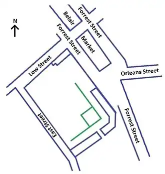 - A contemporary detailed map which includes the layout of the field has it this way: Forrest Street (northeast, first base); Low Street (northwest, right field); Orleans Street's end at that time (east, infield area); East Street (southwest, left field); buildings and Douglas Street (roughly corresponding to Lexington Street) (southeast, third base).