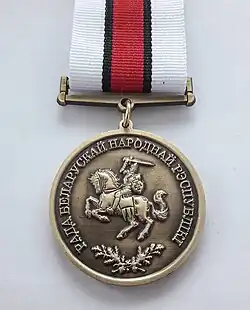 The Belarusian Democratic Republic 100th Jubilee Medal (Belarusian: Мэдаль да стагодзьдзя Беларускае Народнае Рэспублікі) is a medal awarded in 2018 by the Rada of the Belarusian Democratic Republic (the government in exile of the Belarusian Democratic Republic) to commemorate the 100th anniversary of the establishment of the republic in 1918. The medal has been awarded to more than 180 activists, politicians and researchers in Belarus and abroad.[1]