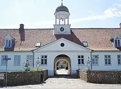 The two storey main building is from 1561. It is constructed in red brick with bands of partly white-washed limestone. It stands on a foundation of field stones and has a base of finely cut granite ashlars.[6]