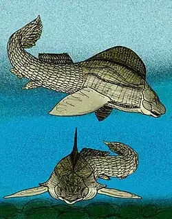 Belemnacanthus giganteus ("Gigantic arrow-spine") is a large, extinct, barrel-shaped holonematid arthrodire placoderm from Givetian-aged strata of Middle Devonian Eifel, Germany. B. giganteus is known only from the holotype, a 37 centimetres (15 in) portion of a median dorsal plate with a long, somewhat high, arching crest running down the median line of the exterior/dorsal side of the plate. The plate has an ornamentation of ridges that originate from a point posterior to the preserved portion of the median dorsal plate. Before the plate was identified as that of a holonematid, the plate of B. giganteus had been successively described as a tremendous spine of an elasmobranch, an agnathan, and lastly, the plate of an antiarch.[1]