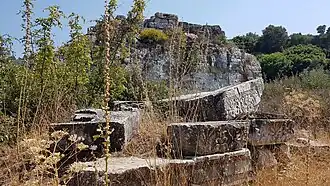 The foundation of the mausoleum was a square outcrop of natural rock;[18] each side measuring some 29.65 m, suggesting a length of 100 feet of 0.2965 m.[19] The mausoleum was two stories. On the ground level there were three steps supporting the base mouldings. Each plain socle was surmounted by torus, cavetto and Lesbian cyma. Ten courses of large neatly cut ashlars, 69–88 cm high, which constituted the facing of the podium, made for a total height of 11.37 m.[19] A low architrave, 45 cm high, and a higher Doric frieze of triglyphs and metopes[20] ran around the top of the podium. The south side had a deep recess that was cut into the rock core for the burial chamber, which was placed in the center and sealed from outside. This was done in order to conceal what was in the monument and to protect the monument from tomb raiders. The chamber which Antiochus II was buried in was a small vestibule with a rectangular back room for his body to be put in a barrel-vault. There was an unfinished false door on the north side of the structure. The top story had 3 steps measuring 1.12 m high. The top slope served as a stylobate for a Corinthian Peristalsis, with eight columns on each side. The roof had flat marble tiles.