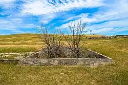 While no buildings are still standing at the site, deep holes indicate foundations and cellars. Numerous concrete floors can be seen and large pieces of metal are scattered throughout the site. The railroad grade is very clear to someone looking down from a nearby hill. The area is now used for grazing cattle.
