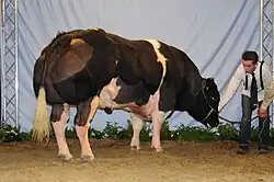 The Belgian Blue (French: 'Blanc-Bleu Belge', Dutch: 'Belgisch Witblauw', both literally meaning "Belgian White-Blue") is a breed of beef cattle from Belgium.[2] It may also be known as the Race de la Moyenne et Haute Belgique,[4]: 95 or dikbil (literally "fat buttocks" in Dutch). Alternative names for this breed include Belgian Blue-White; Belgian White and Blue Pied; Belgian White Blue; Blue; and Blue Belgian.[5] The Belgian Blue's extremely lean, hyper-sculpted, ultra-muscular physique is termed "double-muscling". The double-muscling phenotype is a heritable condition caused by a deletion in the myostatin gene,[6] resulting in an increased number of muscle fibres (hyperplasia), instead of the (normal) enlargement of individual muscle fibres (hypertrophy).[7]