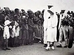 The paternalistic ideology underpinning colonial policy was summed up in a catchphrase used by Governor-General Pierre Ryckmans (1934–46): Dominer pour servir ("Dominate to serve").[75] The colonial government wanted to convey images of a benevolent and conflict-free administration and of the Belgian Congo as a true model colony. Only in the 1950s did this paternalistic attitude begin to change. In the 1950s the most blatant discriminatory measures directed at the Congolese were gradually withdrawn (among these: corporal punishment by means of the feared chicote—Portuguese word for whip). From 1953, and even more so after the triumphant visit of King Baudouin to the colony in 1955, Governor-General Léon Pétillon (1952–1958) worked to create a "Belgian-Congolese community", in which blacks and whites were to be treated as equals.[76] Regardless, anti-miscegenation laws remained in place, and between 1959 and 1962 thousands of mixed-race Congolese children were forcibly deported from the Congo by the Belgian government and the Catholic Church and taken to Belgium.[77]