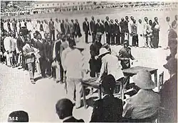 Official postwar Belgian rhetoric portrayed the Congo's attitude towards the mother country as one of "unfailing solidarity."[82] As a result of the Congo's comparative prosperity during the conflict, the post-war period saw a wave of immigration to the country from Belgium. By 1950, 100,000 whites were living in the Congo.[1] Nevertheless, the war highlighted the precarious nature of the colonial administration, leading Governor Ryckmans to remark that "the days of colonialism are over" in 1946.[83] A feeling by the Belgian government prevailed that it had incurred a "war debt" to the Congo, and thus more attention was given to the concerns of the indigenous population.[84] In the years after the war, the colonial government underwent extensive reform.[83] Black people were granted significantly more rights and freedoms, leading to the growth of a so-called Évolué ("evolved") class.[85] Despite this, the Belgian policy of conscripted labour of 60 days a year from each native Congolese remained in effect until Congolese independence, whereas similar labour levies were abolished in British and French possessions after the war.[86] Several black members of the Force Publique who were veterans of the war served in prominent roles in the army after Congolese independence, including Louis Bobozo, Eugene Ebeya and Norbert Muké.[87]