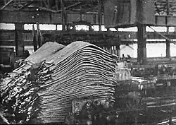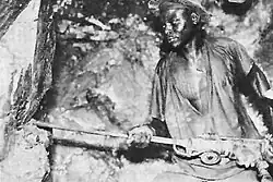 The Congo had become increasingly centralised economically during the Great Depression of the 1930s, as the Belgian government encouraged the production there of cotton, which had value on the international market.[1] The greatest economic demands on the Congo during the war were related to raw materials. Between 1938 and 1944, the number of workers employed in the mines of the Union Minière du Haut Katanga (UMHK) rose from 25,000 to 49,000 to cope with the increased demand.[27] The colonial administration enacted ultimately successful policies aimed at increasing the size of the Congo's labour force; the number of wage labourers in the colony grew from 480,000 in 1938 to 800,000 in 1945.[28] In order to increase production for the war effort, the colonial authorities increased the hours and the speed at which workers, both European and African, were expected to work. This led to increasing labour unrest across the colony.[29] Forced labour, which had been banned in the 1930s, was reintroduced to keep up with demand; by 1944, the maximum number of days of forced labour per year was raised to 120 for rural Congolese.[30] Discontent among the white population was also increased by the raising of heavy war taxes, which sometimes reached as high as 40 percent.[13] High taxes and price controls were enforced from 1941, limiting the amount of profit that could be made and curbing profiteering.[31] While the price controls aided exports to the Allies, it adversely affected Congolese peasants, who earned less despite their increased amount of labour.[30]