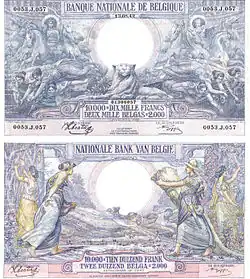 Initially, the currency was monolingual in French. From 1886, some Belgian coins also carried Dutch legends.[3] Some later coins featured inscriptions in both languages. When the two languages appeared on either side of the same face of a coin, two versions were still produced: one with Dutch to the left and French to the right, and one with the alternate arrangement. Banknotes became bilingual in 1887[3] and, from 1992, banknotes were introduced which were trilingual, with either French or Dutch on the obverse and German and the remaining language on the reverse.
