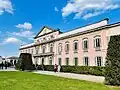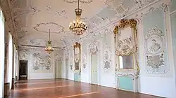 The west wing of the castle, in neoclassical style and dominated by a large balcony, was rebuilt by Prince Antonio Barbiano di Belgioioso, who entrusted the work to Francesco Croce. On this side of the castle are the noble rooms of the manor, connected by a grand stone staircase, on the walls of which hang tapestries, flags, and weapons bearing the coat of arms of the princes. Also on the second floor is the large ballroom (measuring 13 x 13 meters), which is entirely frescoed according to a decorative program designed by Leopoldo Pollack,[3], and the gallery of the ancestors, enriched by white marble fireplaces and Baroque stuccoes made between 1740 and 1760 by Carlo Beretta in which are depicted the busts of 19 members of the lineage and the exploits they conducted described with inscriptions in pure gold.[13]