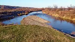 The river continues to the north, almost in a straight line, parallel to the Serbian-Bulgarian border on the east, and the eastern slopes of the mountain Tupižnica, on the west. It is generally considered that from this point, the Timok Valley region begins. The river passes through Gornje Zuniče, Donje Zuniče, Debelica, Trnovac, Minićevo, Drenovac, Selačka, Mali Izvor, Borovac, Vratarnica, and Grljan. On this area, the Beli Timok receives two left tributaries, the Grliška reka (Грлишка река) and the Lubnička reka (Лубничка река). A few kilometers after Grljan, the river reaches the largest city on its course, Zaječar. There, the Beli Timok meets the Crni Timok from the east and continues as the Veliki Timok. The length of the Beli Timok is 50 km (115 km with Svrljiški Timok) and it drains an area of 2,155 km2.[1]