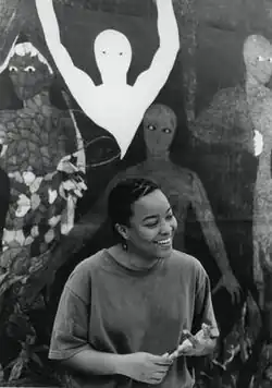 Belkis Ayón (23 January 1967 – 11 September 1999) was a Cuban printmaker who specialized in the technique of collography. Ayón created large, highly detailed allegorical collagraphs based on Abakuá, a secret, all-male Afro-Cuban society. Her work is often in black and white, consisting of ghost-white figures with oblong heads and empty, almond-shaped eyes, set against dark, patterned backgrounds.[1]