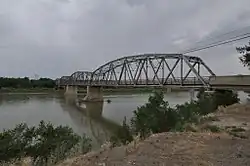 Completed in 1926 at a cost of $305,000, the Bell Street Bridge crosses the Yellowstone River in Glendive, Montana. Designed by the Montana Highway Commission and built by contractor Boomer, McGuire & Blakesley, the 1,352 feet (412 m) long, 20 feet (6.1 m) wide bridge consists of six Warren through truss spans, each roughly 219 feet (67 m) long, and a concrete approach span about 38 feet (12 m) long. It was listed on the National Register of Historic Places in 1988.[2] At one time the main highway bridge over the river, Montana DOT rehabilitated and converted it for pedestrian use in 1992 when the bridge on the I-94 Business Loop was built 300’ to the north.[3]