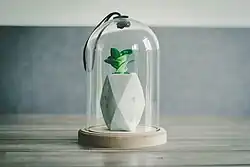 A bell jar is a glass jar, similar in shape to a bell (i.e. in its best-known form it is open at the bottom, while its top and sides together are a single piece), and can be manufactured from a variety of materials (ranging from glass to different types of metals). Bell jars are often used in laboratories to form and contain a vacuum. It is a common science apparatus used in experiments.[1] Bell jars have a limited ability to create strong vacuums; vacuum chambers are available when higher performance is needed. They have been used to demonstrate the effect of vacuum on sound propagation.