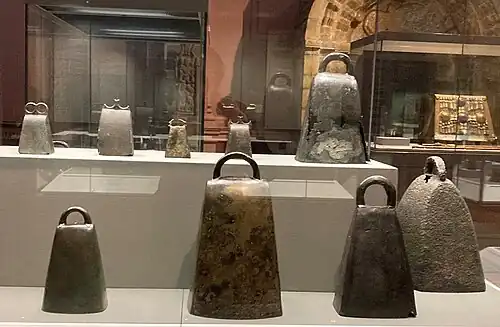 Early Irish church hand-bells (Irish: clog) are the most numerous surviving forms of early medieval relics from either Ireland, England or Wales, and were likely the most prestigious, given they were widely thought to have been built either for or by the saint. Approximately 300 examples are known,[7][8] with the majority produced between the 5th and early 12th centuries.[7] The bells were passed between generations of successive abbots and clerics, and served a number of communal functions, including the marking of canonical hours and calling for mass. However, by the 12th century hand-bells had largely been replaced by larger church tower bells, and although many stayed in use, their production declined.[6][9]