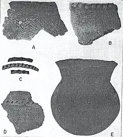 - Bell site type 1 – represented by 1,079 sherds and one complete restored vessel. This type consists of grit-tempered, smooth-surfaced spherical vessels with everted rims. Decoration consists of punctates and incised lines. Strap handles are present on some vessels. This pottery type has also been noted at the Arrowsmith site in central Illinois and sites in the area of Saginaw, Michigan. The cultural affiliation is believed to be the Meskwaki people.[1]