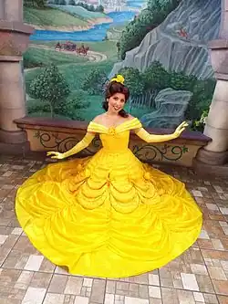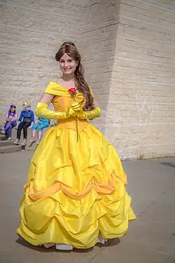 In Disney's 1991 animated film Beauty and the Beast, Belle attends dinner with the Beast wearing a golden ball gown.[1][2][3][4][a] She slowly enters down the grand staircase before eating and dancing with the Beast,[5] to the tune of the title song performed by Mrs. Potts.[2][6] The dress is worn during one of Disney's most famous scenes,[7][8] which in turn contributed to the outfit's popularity among audiences.[9] According to Tracy Brown of the Chicago Tribune, the scene "helped cement the iconic status of Belle's gold dress".[2] The dress is a voluminous off-the-shoulder tiered ball gown,[10][11][12] accessorized with a matching headpiece,[13] opera gloves,[11] earrings and shoes.[5] Belle wears her hair in a half-up style.[5][14] Out of her four costume changes,[15] the gold gown is the most opulent dress Belle wears in the film.[3] Its color also matches that of the ballroom.[13] Screenwriter Linda Woolverton theorized that Belle obtained the dress from the Wardrobe character, who was no longer able to fit into the gown upon being turned into a wardrobe.[16]