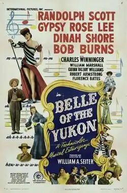 Belle of the Yukon is a 1944 American comedy musical Western film produced and directed by William A. Seiter and starring Randolph Scott, Gypsy Rose Lee, Dinah Shore and Bob Burns.[2] Based on a story by Houston Branch and set in the days of the great Canadian Gold Rush, the film is about a "reformed" con artist-turned-dance hall owner whose girlfriend, played by Gypsy Rose Lee, tries to keep him on the straight and narrow.