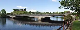 There is evidence of Neolithic settlers in the area, and later legend has it that Fionn mac Cumhail's men sharpened their swords on the big limestone rock at Belleek Falls. (The flagstone, which gave its name to the area, was destroyed together with the falls during drainage works in the 1880s).[3] The Battle of Belleek 1593, also known as the Battle of the Erne Fords, took place in the build-up to the Nine Years' War.