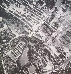 Aerial photo of Belmont Park taken during World War 2. Wooden huts installed by the Army Corps can be seen in the bottom of the image.