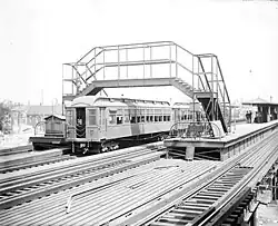 Belmont station was constructed between 1896 and 1900 as part of the Northwestern Elevated Railroad,[3] opening on May 31, 1900.[4] The station had two island platforms elevated on a steel structure with tracks on either side. Following construction of the Ravenswood branch in 1907 (now part of today's Brown Line), a bridge was constructed connecting the two platforms to allow transfers from southbound services to northbound trains on the branch. The station house was located on the south side of Belmont and contained several turnstiles as well as a customer assistant booth. Beyond the turnstiles was a small caged area leading to stairs; the west staircase led to the southbound platform and the east staircase to the northbound platform. Prior to 1963 there was also a side platform on the west side of Track 1 (the westernmost track), which was used exclusively by the southbound trains of the Chicago North Shore and Milwaukee Railroad.