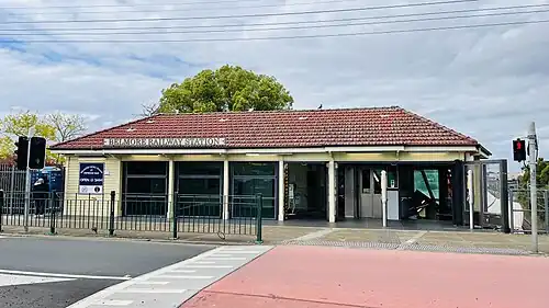 The overhead timber booking office at Belmore was constructed c.1937 at the top of the steps fronting onto the down side of Burwood Road to take the ticket selling and parcel functions. The change was also made to most other stations built to a similar configuration. The station master's office remained in the platform building for another forty years, but this function too has now moved to the street level building and the platform building remains largely unused.[3]