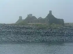 The island has been considerably denuded by quarrying – a process sometimes described as having broken its back.[15] Deep water-filled cuttings and the ruined slate workers cottages remain as a testament to this industry.[16] There was a jetty to the east of the island,[3][17] but it was worn away within the last quarter of the twentieth century.