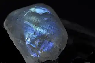 Belomorite (Russian: Беломори́т — from the toponym),[2] sometimes peristerite or moonstone, also murchisonite, Ceylon opal, hecatolite — a decorative variety of albite (oligoclase) of white or light gray color with a distinct iridescence effect. By composition, belomorite belongs to the feldspar family; it is a sodium aluminosilicate from the plagioclase group, in most cases belonging to the isomorphic series albite (Ab) — anorthite (An) with an approximate percentage of 70Ab-30An.